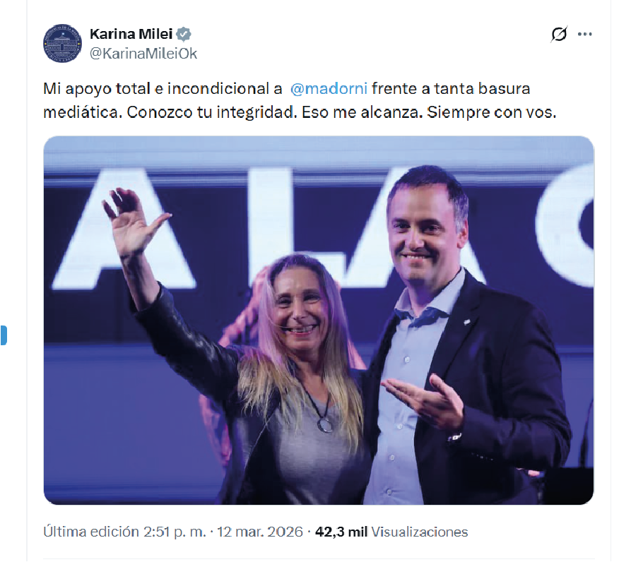 A través de su cuenta en la red social X, la funcionaria expresó: “Mi apoyo total e incondicional a @madorni frente a tanta basura mediática”, en un mensaje breve pero contundente que rápidamente generó repercusiones en el ámbito político y mediático.